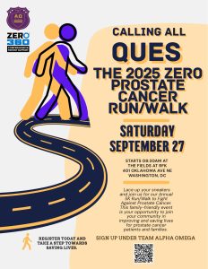 The Zero 360 Prostate Walk/Run, scheduled for September 27, 2025, at the Fields at RFK, 401 Oklahoma Ave, NE, Washington, D.C, starting at 8:30 AM. Brothers and their families, as well as loved ones, can register using the QR Code on the flyer. Sign up under Team Alpha Omega. Participation in the event is free. Those who choose to donate can receive a T-shirt for a donation of $50 or more.